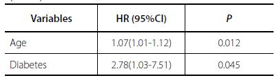 Among the PM population, survival was significantly lower in the PCS group (6.52 ± 0.72 years vs. 8.72 ± 0.3 years, P=0.013) (Figure 1). Nonetheless, after multivariate Cox regression analysis, age and diabetes were the only independent predictors of survival (Table 4).