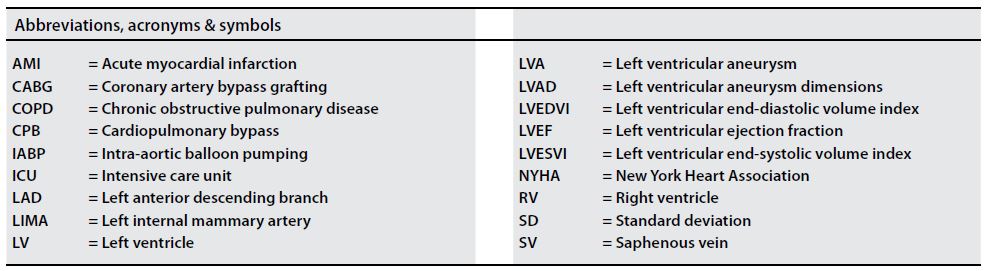 Conclusions: Off-pump linear plication presented acceptable results in terms of early outcomes and long-term survival. For high-risk patients, the simplified LVA repair technique may be an option.