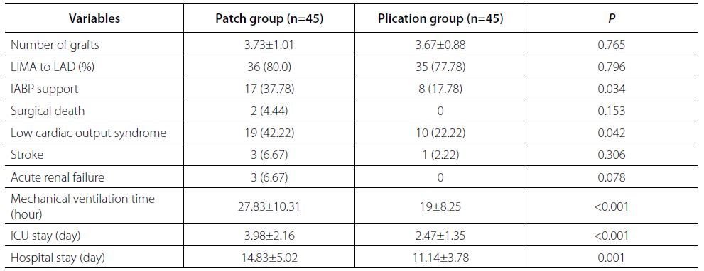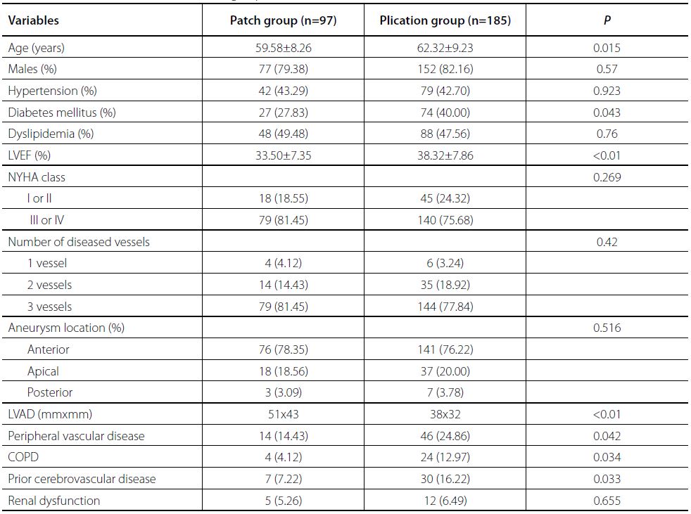 Objective: The study aimed to compare the clinical outcomes of simplified linear plication and classic patch plasty in patients with left ventricular aneurysm (LVA).