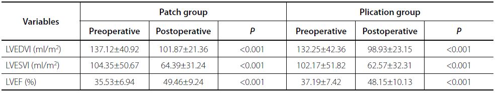 No significant statistical difference was found between the two matched groups in terms of number of grafts and LIMA-left anterior descending branch (LAD) anastomosis. The early mortality at discharge was 4.44% in the patch group, but there was no early death in the plication group. In addition, patients in patch group more commonly suffered from low cardiac output syndrome (42.22% versus 22.22%, P=0.042) with higher proportion of intra-aortic balloon pumping assistance (37.78% versus 17.78%, P=0.034) than those in the plication group. Major postoperative complications including stroke and acute renal failure were similar between the two matched groups, but patients in the plication group had shorter recovery time, regarding to mechanical ventilation, intensive care unit (ICU) stay, and hospital stay (P<0.001, P<0.001, and P=0.001, respectively) than those in the patch group. The details were showed in Table 3. Patch plasty and linear plication repairs both improved cardiac geometry and function remarkably. The echocardiography indicated that no significant differences between the two surgical techniques were founded with respect to LVEF, left ventricular end-diastolic volume index (LVEDVI), and left ventricular end-systolic volume index (LVESVI) (Table 4).