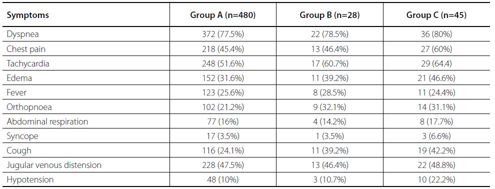 ECHO was used to determine both the diagnosis and the severity of effusion. While assessing the severity, if the distance between the left ventricular posterior wall and the pericardium during diastole is below 10 mm, it is accepted and classified as mild PE; between 10 mm and 20 mm, it is classified as moderate PE; and over 20 mm, as severe PE[2]. Cardiac tamponade was defined by clinical evaluation and ECHO of the patient. Tachycardia, although it is not a lung problem, causes dyspnea and tachypnea and increased the central venous pressure (CVP). In case of presence of classic symptoms, such as hypotension and pulsus paradoxus tamponade, patients were classified as tamponade (Table 1).