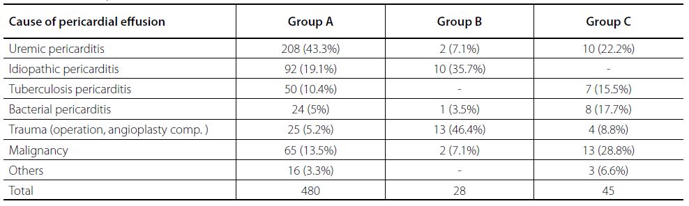 Methods: In order to get comparable results, the patients with PE were divided into three groups - group A, 480 patients who underwent subxiphoid pericardiostomy; group B, 28 patients who underwent computerized tomography (CT)-guided percutaneous catheter drainage; and group C, 45 patients who underwent echocardiography (ECHO)-guided percutaneous catheter drainage.