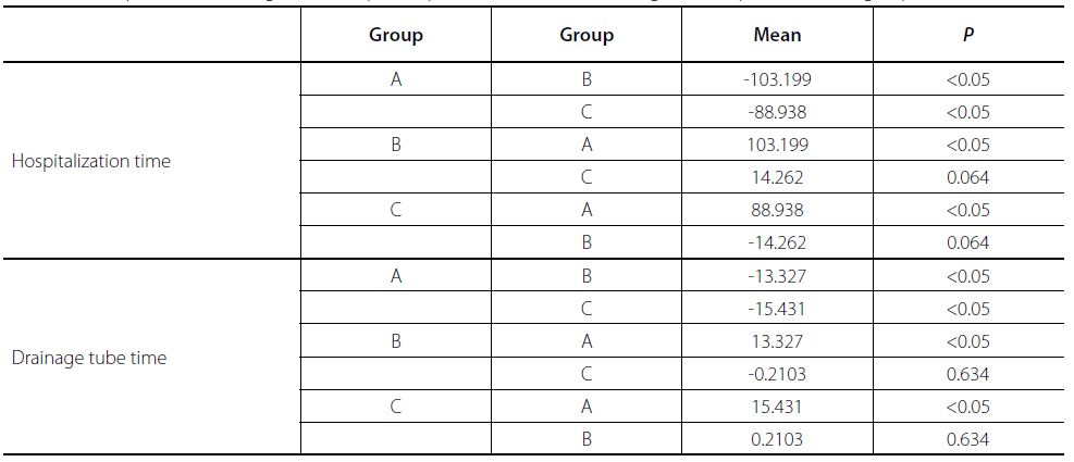 Statistical analyses of the results were done using the Statistical Packet for Social Science (SPSS) 11.0 software and x² and post-hoc tests were applied to the data. In this study, recurrent effusion ratios obtained from the groups, the number of cases developing constriction, complication rates, and 1-month mortality were determined by x² tests, 3x2 contingency table, or 2x2 Fisher's exact test. For the length of in-hospital stay and duration of the catheter or drainage tube stay, a two-way analysis of variance (ANOVA) was used. In bilateral comparisons, P-values were obtained by applying the least square difference (LSD) method and interpreted; P values < 0.05 were considered significant.