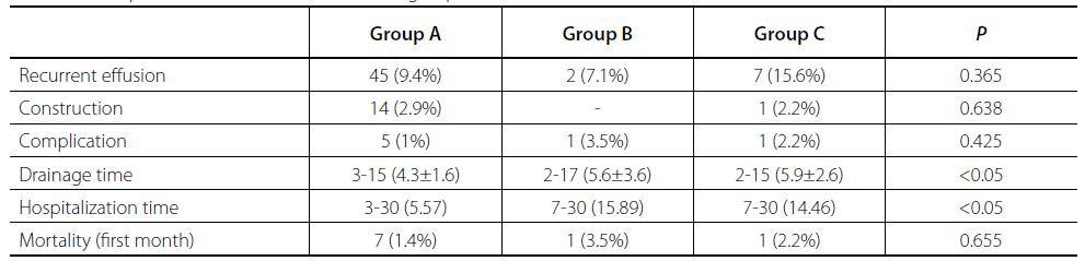 Data obtained from our patients showed the development of recurrent effusion (P=0.365), constriction rate (P=0.638), complication rate (P=0.425), and mortality rate in the first follow-up month (P=0.655). There was no significant difference between the three groups (P<0.05) (Table 2).