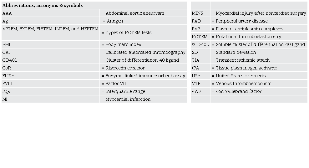 Methods: We enrolled 38 patients with ≥ 45 years old undergoing surgery for abdominal aortic aneurysm or peripheral artery disease under general or regional anesthesia and who were hospitalized at least one night after the procedure. Patients undergoing carotid artery surgery and those who had acute bypass graft thrombosis, cancer, renal failure defined as estimated glomerular filtration rate < 30 ml/min/1.73m2, venous thromboembolism three months prior to surgery, or acute infection were excluded from the study. We measured levels of markers of hemostasis (factor VIII, von Willebrand factor:ristocetin cofactor [vWF:CoR], antithrombin), fibrinolysis (D-dimer, tissue plasminogen activator [tPA], plasmin-antiplasmin complexes), and soluble cluster of differentiation 40 ligand (sCD40L) before and 6-12h after vascular procedure.