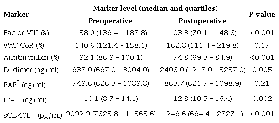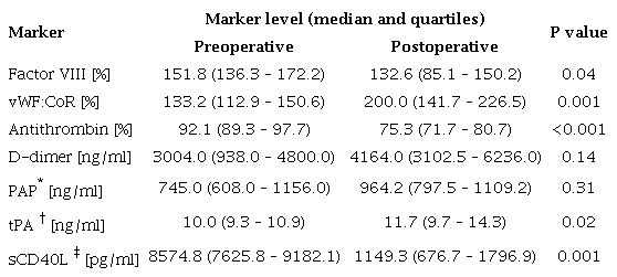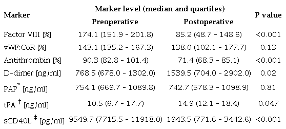 Results: Significant differences between preoperative and postoperative levels of factor VIII (158.0 vs. 103.3, P<0.001), antithrombin (92.1 vs. 74.8, P<0.001), D-dimer (938.0 vs. 2406.0, P=0.005), tPA (10.1 vs. 12.8, P=0.002), and sCD40L (9092.9 vs. 1249.6, P<0.001) were observed. There were no significant differences between pre- and postoperative levels of vWF:CoR (140.6 vs. 162.8, P=0.17) and plasmin-antiplasmin complexes (749.6 vs. 863.7, P=0.21).