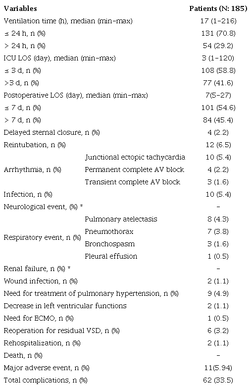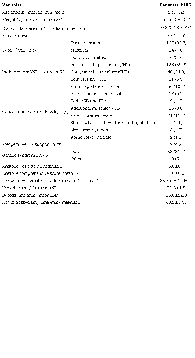 Results: VSD closure was performed in 185 patients. The median age was five (1-12) months. There was prolonged MV time in 54 (29.2%) patients. Four patients (2.2%) required permanent pacemaker implantation. Hemodynamically significant residual VSD was observed in six (3.2%) patients. Extracorporeal membrane oxygenation-cardiopulmonary resuscitation was performed in one (0.5%) patient. Small age (< 4 months) (P-value<0.001) and prolonged cardiopulmonary bypass time (P=0.03) were found to delay extubation and to prolong MV time. Low birth weight at the operation was associated with MAE (P=0.03).