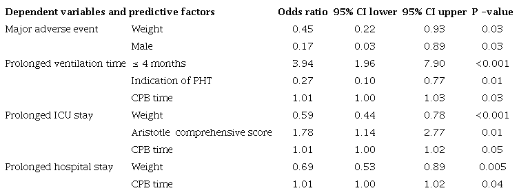 A multivariable model was used to assess the association between a patient’s characteristics and the risk of MAE, prolonged MV time, or prolonged ICU or hospital stay (Tables 3 and 4). According to the model, LBW at the time of the operation was associated with a MAE (odds ratio [OR] 0.45, 95% confidence interval [CI] 22-0.93, and P=0.03). The MAE frequency was lower in males than in females (OR 0.17, 95% CI 0.03-0.89, and P=0.03). Age (< 4 months) and prolonged CPB time were found to delay extubation and to prolong MV (OR 3.94, 95% CI 1.96-7.90, P<0.001 and OR 1.01, 95% CI 1.00-1.03, P=0.03, respectively). Patients who underwent surgery because of PHT had a lower MV time (OR 0.27, 95% CI 0.10-0.77, P=0.01) than the others. An extended ICU stay was associated with patients who had a long CPB time and a high Aristotle comprehensive complexity score (OR 1.01, 95% CI 1.00-1.02, P=0.05 and OR 1.78, 95% CI 1.14-2.77, P=0.01, respectively). However, a high body weight at the time of the operation shortened the ICU stay (OR 0.59, 95% CI 0.44-0.78, P<0.001).