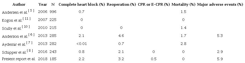 Postoperative outcomes and complications were assessed and included the length of hospital and ICU stays, duration of MV, postcardiotomy syndrome, renal failure, chylothorax, temporary or permanent complete heart block, neurological events, sudden circulatory collapse, diaphragmatic paralysis, postoperative extracorporeal membrane oxygenation (ECMO) support, readmission to hospital, and death[9]. The duration of MV was considered to be prolonged if it lasted more than 24 hours; an extended ICU or hospital stay lasted longer than three days and seven days, respectively. Significant major adverse events (MAE) included unplanned reoperations, complete heart blocks requiring implantation of a permanent pacemaker, sudden cardiac arrest, and death.