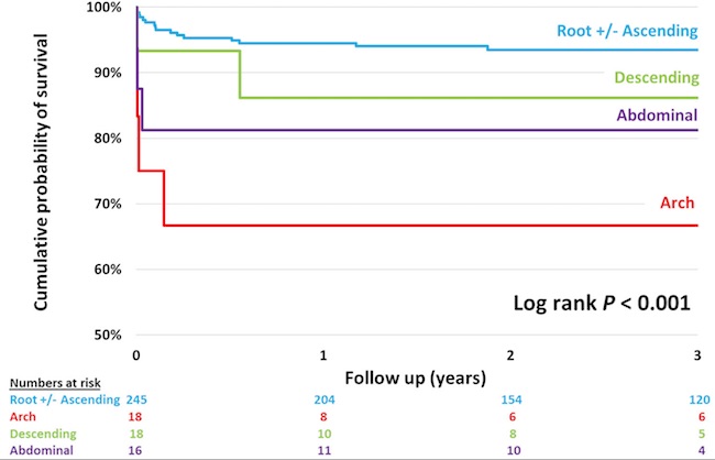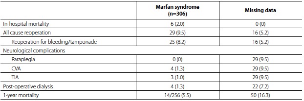 The all-cause in-hospital mortality rate for all MFS patients undergoing aortic root or ascending aorta surgery was 2.0% (6 patients). No patients suffered paraplegia, 4 (1.3%) patients had post-operative CVA and 3 (1.0%) patients had transient ischemic attack (TIA). Twenty-five patients (8.2%) had reoperation for bleeding or tamponade; 1-year follow-up mortality was 5.5%. Table 4 summarises these outcomes.
