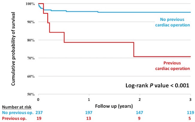 Figure 2 shows a survival comparison stratified by patient history of previous cardiac operations, demonstrating a significant survival benefit for patients undergoing a first-time procedure (P<0.001).