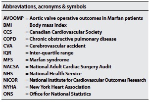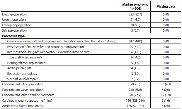 Results: Root and ascending segment procedures on Marfan patients performed in 3.3% of the total cohort by NICOR root surgery patients. The median reported age was 40 years (IQR = 29-49 years) and 100 (32.7%) were female. Of the patients analysed, 17.3% were treated non-electively and 68.6% of them received concomitant valve procedure. The in-hospital mortality was 2.0%. Reoperation for bleeding was required in 8.2% of patients and 1.3% of them suffered a cerebrovascular accident (CVA). Mortality at 1 year was reported as 5.5%.
