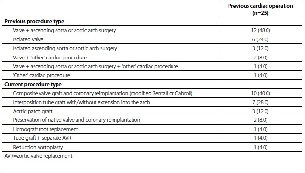 Twenty-five (8.2%) patients had undergone cardiac surgery during a previous hospital admission. Both previous and current surgeries for these patients are shown in Table 3.