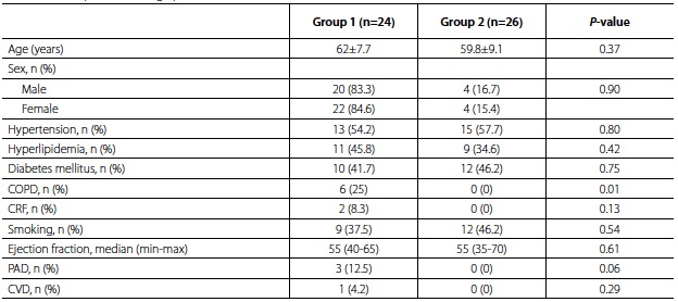 Since all patients included in the study were diabetic, patients with mild cognitive dysfunction from both groups were present preoperatively. These patients were not excluded because DM is a disease that affects cognitive functions and did not cause a significant difference in terms of between groups preoperative MoCA test. Therefore, the mean preoperative MoCA score of both groups was slightly low (24.8±2.2 vs. 25.2±2.0, P=0.59) (Table 3). The mean MoCA score and therefore the cognitive functions of patients being monitored for rSO2 with NIRS in the postoperative period were significantly higher than those monitored with standard follow-up parameters (23.6±2.6 vs. 26.0±2.3, P=0.001) (Table 3). The mean postoperative MoCA score of Group 1 patients who were followed with standard follow-up parameters during CABG was significantly lower than the mean preoperative MoCA score (24.8±2.2 vs. 23.6±2.6, P=0.02) (Table 3). The postoperative and preoperative MoCA scores of patients in Group 2 who were monitored for rSO2 with NIRS were similar (25.2±2.0 vs. 26.0±2.3, P=0.06) (Table 3). Mild cognitive dysfunction was observed in 13 (54.2%) patients in Group 1 and in 5 (19.2%) patients in Group 2. Severe cognitive dysfunction occurred in 2 (8.3%) patients in Group 1, but none in Group 2. When the groups were compared in terms of mild cognitive dysfunction, it was significantly lower in Group 2 (P=0.02) (Table 3). Even though severe cognitive dysfunction was more frequently observed in Group 1, it was not significant (P=0.22) (Table 3).