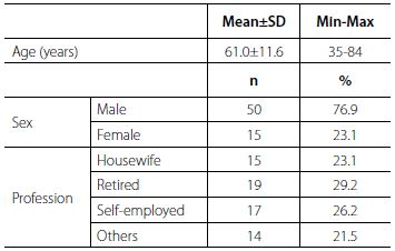 Beck’s Depression Inventory (BDI) and Beck’s Anxiety Inventory (BAI) tests were performed in patients with diagnosis of coronary artery disease (CAD) and were awaiting CABG surgery. Fifty of these patients were males, and fifteen were females. Their average age was 61.0±11.7 years. Patients’ demographic data are on Table 1. Fifteen of the patients were housewifes, 19 were retired, 17 were self-employed, and 14 had another profession. Patients were taken to a quiet room with the doctor. The doctors asked questions from the BDI and BAI tests to the patient. The patients answered both the BDI and BAI tests. The answers were marked by the doctors on the tests. The patients were admitted to the cardiovascular surgery clinic two days before the operation. The tests were done on the preoperative 1st day and postoperative 3rd day with in-hospital patients and on the postoperative 7th and 30th days with out-hospital patients. The exclusion criterion was the presence of hemodynamic instability. No patient reported use of psychotropic drugs. No patient had any chronic psychological illness. The medical history of the patients was obtained and ıt was decided whether or not to be included in the study. The study protocol was approved by the institutional Ethics Committee of Haliç University (2018/09-82-10). The study was conducted in accordance with the principles of the Declaration of Helsinki.