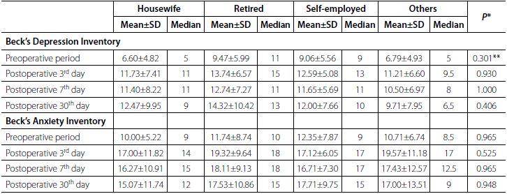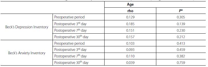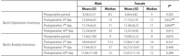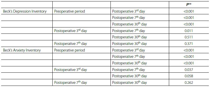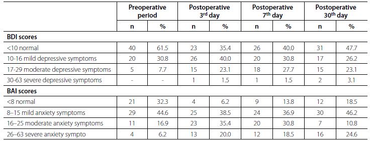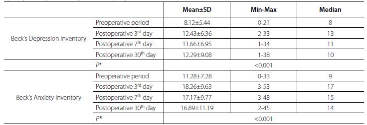 However after the postoperative 3rd day, there was no statistical changing in depression and anxiety levels compared with postoperative 7th and 30th days. Average BDI were 11.66±6.95 and 12.29±9.08 on postoperative 7th and 30th days, respectively. Average BAI were 17.17±9.77 and 16.89±11.19 on postoperative 7th and 30th days, respectively. The results of this subgroup analysis are presented on Table 3.