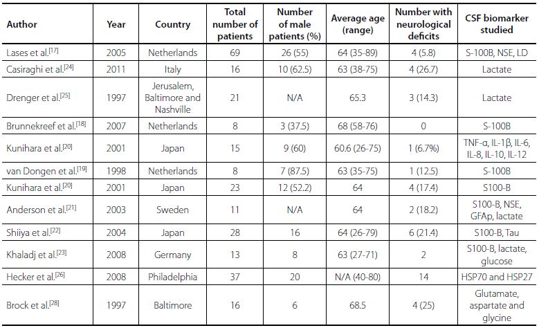 Lases et al.[17] described a prospective clinical study of 69 patients undergoing thoracoabdominal aneurysm repair were CSF samples taken at times of induction of anaesthesia, application of aortic cross-clamping, 5 min, then 2, 4, 6, 8 and 19 hours after reperfusion. These results were concomitantly compared to serum samples and motor evoked potentials from transcranial electrical stimulation and somatosensory evoked potentials (SSEP). In this study, S-100β levels in the CSF could not be associated with silent neurological damage or adverse neurological complications postoperatively. However, CSF S-100β was higher in 75% of patients who suffered adverse neurological complications postoperatively than the 90th percentile of patients without neurological complications. The median concentration of CSF S-100β remained virtually unchanged and within reference range without adverse neurological complications.