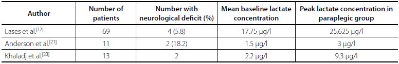 Five studies have reported intraoperative lactate levels during thoracoabdominal aneurysm repair17,21-25)], however, only three studies compared lactate CSF levels in patients with neurological deficit compared to controls (Table 3)[23-25]. In these patients, the lactate levels were significantly higher in patients that developed SCI postoperatively. It is also imperative to mention that when lactate was measured concomitantly with other biomarkers, it was the first biomarker to raise[17,21,23], nevertheless, such raise in lactate level was non-specific as it was noted to raise at time of aortic cross-clamp application in patients without developing SCI postoperatively.