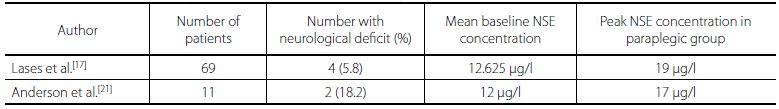 Neuron-specific enolase is a 78 kD gamma-homodimer and represents the dominant enolase-isoenzyme found in neuronal and neuroendocrine tissues. Its levels in other tissues, except erythrocytes, are negligible. The biological half-life of NSE in body fluids is approximately 24 hours. A comparative NSE level in CSF was measured in two studies (summarized in Table 4). Lases et al.[17] compared NSE to standard MEP monitoring in their study. In their group of patients, 4 suffered postoperative paraplegia. However, the association between CSF levels of NSE and postoperative paraplegia was poorly correlated, among those patients that suffered SCI, 50% had levels of NSE greater than the 90th percentile of patients with no adverse neurological outcomes. The rise in CSF levels of NSE was at late stage in the postoperative course (19 hours) and did not add value to the data obtained from MEPs. The second study was conducted by Anderson et al.[21]. In this study, the NSE level in patient with paraplegia was at the upper limit throughout the procedure and this did not change significantly during the entire procedure, however this was non-specific as the same increase was noted in patients who did not develop any evidence of SCI, on the contrary, it was noted that one of the patients who developed stroke postoperatively had a high level of serum NSE which peaked at first postoperative day. Ultimately, their study shows poor correlation between CSF and serum NSE value and, thus, prediction of SCI (r=0.56, P=0.05).