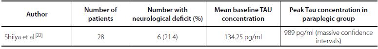 In a study by Shiiya et al.[22], they reported the levels of Tau protein in CSF for 28 patients that underwent DTAAR or TAAR (summarized in Table 5). In their study, incidence of postoperative spinal cord ischaemia was recorded in 4 of the 28 patients and TAU was significantly associated with brain infarction, but it failed to rise at all or detect spinal cord injury when compared to controls in this group of patients. Therefore, use of such biomarker remains unpredictive for SCI during open aortic repair surgeries.