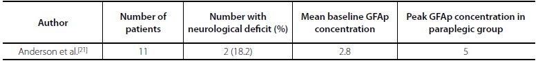 Anderson et al.[21] reported the only study in which GFAp was measured in 11 patients that underwent DTAAR or TAAR (summarized in Table 6). In this study, one patient suffered delayed SCI and showed a 270-fold increase from baseline in CSF GFAp. In this patient, paraplegia developed 30 hours after surgery; GFAp levels were elevated before and after cardiopulmonary bypass, increasing 3-fold between 1 and 6 hours after surgery to 270-fold at 20 hours. On the contrary, one patient showed raised postoperative GFAp levels despite no adverse neurological events being noted.