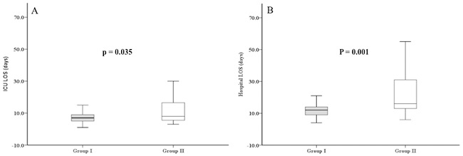 The median HLOS was 12 days (IQR: 9 - 14) and 16 days (IQR: 15 - 32) for Groups I and II, respectively. The median ICU LOS was seven days (IQR: 5 - 9) and eight days (IQR: 5 - 17) for Groups I and II, respectively (Figure 1).