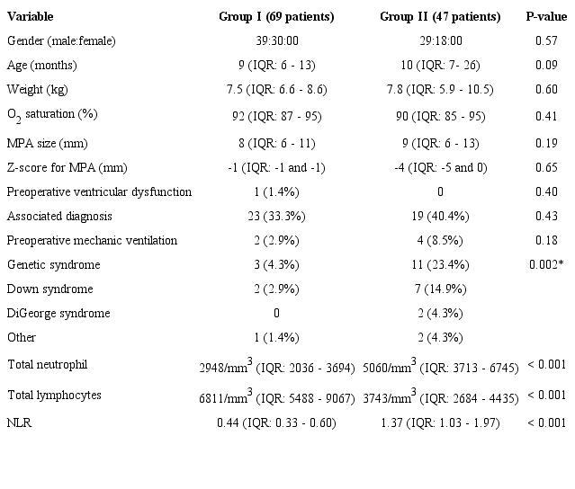 A total of 116 patients met the inclusion criteria and were included in the statistical analysis. In Group I (69 patients), the total neutrophil was 2948/mm3 (IQR: 2036 - 3694) and the total lymphocytes was 6811/mm3 (IQR: 5488 - 9067). The median preoperative NLR was 0.44 (IQR: 0.33 - 0.60). In Group II (47 patients), the total neutrophil was 5060/mm3 (IQR: 3713 - 6745) and the total lymphocytes was 3743 (IQR: 2684 - 4435); in this group, the median preoperative NLR was 1.37 (IQR: 1.03 - 1.97). The median age was nine months (IQR: 6 - 13) in Group I and 10 months (IQR: 7 - 26) in Group II (P=0.09). Males accounted for 58.6% (68 patients) of the study population. Genetic syndrome or chromosomal abnormality was present in 12.1% of patients and the most common was Trisomy 21 (7.8%). The number of patients with a genetic syndrome was higher in Group II (Table 1). There was no association between the preoperative NLR level and the degree of hypoxia (P=0.41) or gender (P=0.57).