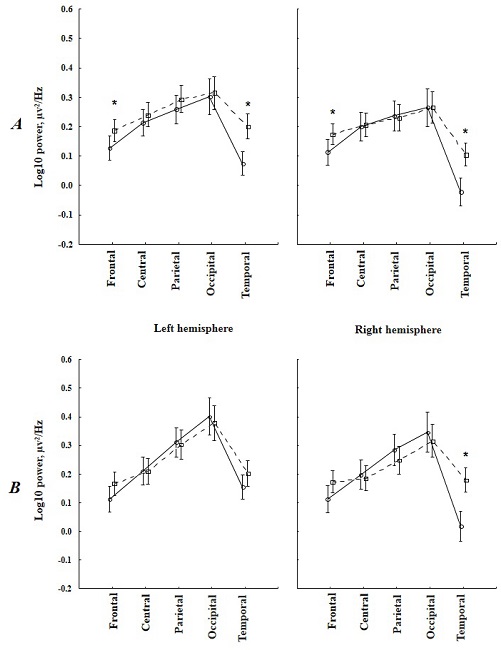 For the alpha-1 range, with the eyes open, the factor of TIME - (F(1, 43)=4.65, P=0.04) interacted with TIME × AREA - (F(4, 172)=4.96, P=0.006) and GROUP × TIME × AREA × LATERALITY - (F(4, 172)=5.07, P=0.0025). All patients exhibited increased alpha-1 power compared to baseline. Significant changes were found in the occipital and temporal cortices, which were more pronounced in the group of patients with cognitive decline.