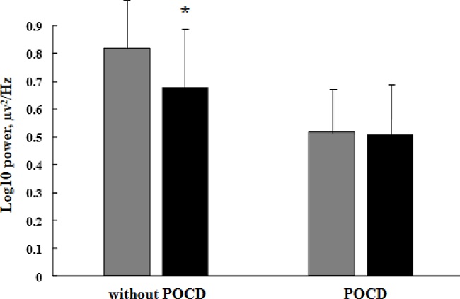 The ANOVA revealed significant interactions associated with postoperative cognitive decline in the theta and alpha frequency ranges.