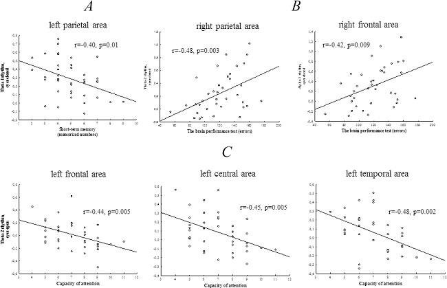 The results of the correlation analysis are presented in Figure 3. The number of memorized numbers negatively correlated with theta-1 power with the eyes closed in the left parietal cortex. The number of errors during the brain performance test directly correlated with the theta-2 and alpha-1 rhythm power with the eyes closed in the right hemisphere. In addition, the number of missed signals negatively correlated with the theta-2 power in the posterior brain regions (left and right hemispheres). Negative correlations between the attention and theta-2 power with the eyes open in all areas of the left hemisphere were found.
