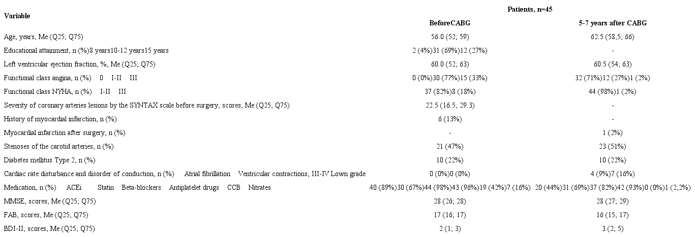 Methods: Forty-five male patients with stable coronary artery disease aged 45-69 years underwent extended neuropsychological assessment using the software Status PF and electroencephalographical examination 3-5 days before CABG and 5-7 years after CABG. Postoperative decline in cognitive functions was determined by a 20% decrease in the cognitive indicator compared to that at baseline on 20% of the tests included in the Status PF battery. Statistical analysis was performed using the software STATISTICA 10.0. Multiple regression was used to identify demographic, clinical, and electroencephalographical variables associated with adverse cognitive outcomes.