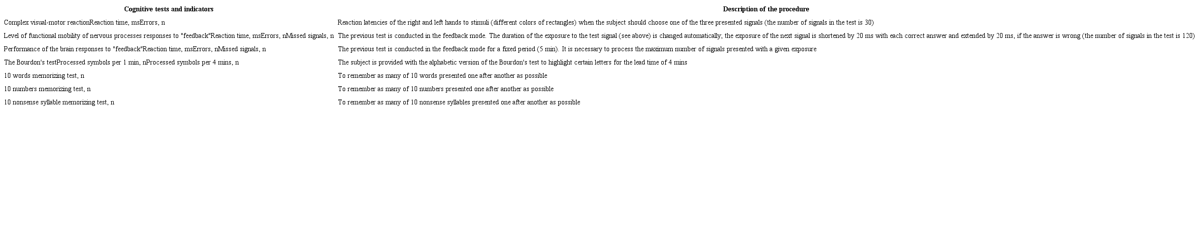 MMSE and FAB were used for cognitive screening. Neuropsychological testing included the assessment of psychomotor and executive function, attention, and short-term memory using the neuropsychological test battery from the psychophysiological complex software Status PF. The detailed description of the neuropsychological tests is shown in Table 2. Postoperative cognitive decline five years after CABG was determined by a 20% decrease in the cognitive score compared to baseline in 20% of the tests [16,17]. The integral cognitive status index (CSI) was calculated by determining the average distance from the patient’s values to the reference ones using the following formula:
