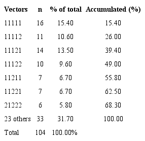 The study showed only a small portion of the 243 possible utility vectors for the EQ-5D. Elderly patients without PM presented 31 vectors, of which seven represented 70.7% of the survey responses. The elderly with PM presented 30 vectors, of which seven represented 68.3% of the total responses of the interviewees (Tables 2 and 3).