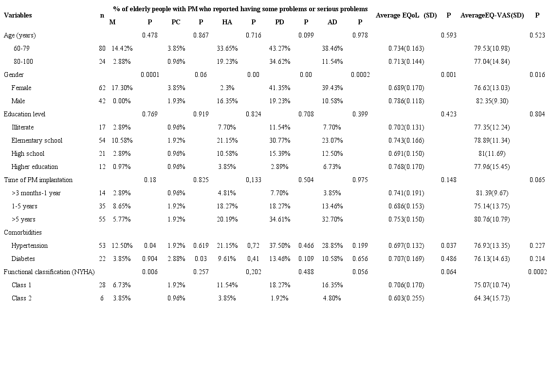 The percentage of elderly with PM who answered 2 ("some problems") or 3 ("serious problems") in the EQ-5D, according to the demographic variables, is shown in Table 4.