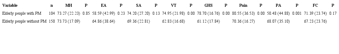 In each of the eight SF-36 domains, the average and standard deviation values were calculated for the two groups of elderly people analyzed. Patients with PM presented higher statistically significant averages in the domains of vitality (P=0.00), general health status (P=0.00), and pain (P=0.00) in comparison to those without PM. Different analyzes were observed in the physical aspects’ domain, in which patients with PM presented a lower average (P=0.001) than those without PM (Table 5).