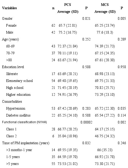 When analyzing PCS and MCS, according to the demographic variables, there was a statistically significant difference for the variables gender, functional class, and time interval of the PM implant (Table 6).