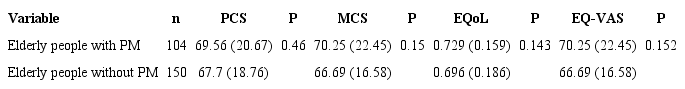 Methods: This study included elderly patients divided into a group with PM and another without PM. Information on HRQoL was obtained using the EQ-5D and SF-36 questionnaires.