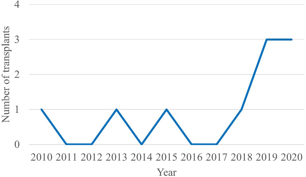 More than half of the transplants were performed in the last three years, as shown in Figure 1.