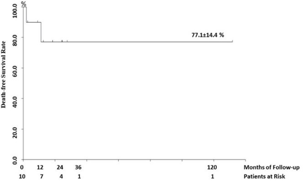 Therefore, overall death-free survival rate was 77.1±14.4% at 131 months of follow-up (Figure 2). Median follow-up time was 15.6 (9.6-24.5) months.