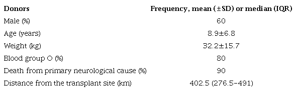 Individuals with verified brain death who were determined to be potential organ donors by the Brazilian Central de Notificação, Captação e Distribuição de Órgãos were considered after excluding contraindications that might cause risk to recipients, such as patients with complex heart diseases, evidence of myocardial dysfunction, active bacterial or fungal infections, viral infections, such as HIV, HBV, HCV, and HTLV 1-2, ABO incompatibility, and inadequate graft size for the recipient. The mean age of the donors was 8.9±6.8 years, with 60% comprised of males (Table 2).