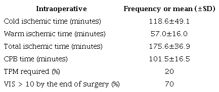 Table 3 displays the characteristics of the surgical procedure. Donors were at centers located from 276.5-491 km from our center, where the recipients were cared for and would be receiving their heart transplants. The mean CPB time was 101.5±16.5 minutes, and all grafts were transplanted with a total ischemia time of < 240 minutes. Seventy percent of the patients required high-dose vasoactive drugs (vasoactive-inotropic score [VIS] > 10) after weaning from CPB, and two patients required temporary pacing due to inadequate chronotropy in the first six hours. All patients were transfused intraoperatively with packed red blood cells and fresh frozen plasma (even for CPB priming, if indicated).