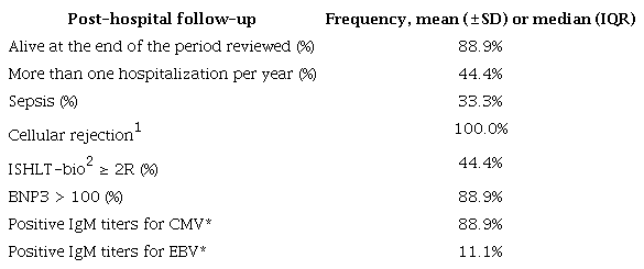 All transplant patients underwent periodic transdisciplinary assessment with outpatient visits and complementary tests including chest X-ray, electrocardiogram, echocardiography, calcineurin inhibitor (cyclosporine or tacrolimus), serology monitoring, and hemodynamic assessment with endomyocardial biopsy. Serum drug monitoring goal for oral cyclosporin was 300-350 ng/mL (0-3 months after transplant), 250-300 ng/mL (3-6 months), 200-300 ng/mL (6-12 months), and 100-200 ng/ml (after one year). Serum drug monitoring goal for tacrolimus was 10-15 ng/ml (0-6 months) and 5-10 ng/ml (after six months).