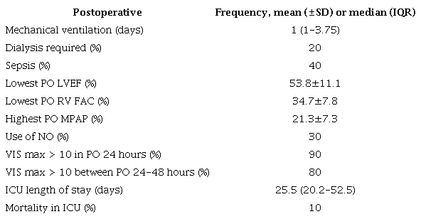 Eight patients were extubated before the fifth postoperative day, six (60% of the total) in the immediate postoperative period. After the first 48 hours, 80% of transplant recipients maintained VIS > 10. Three patients used NO, and two progressed to renal failure requiring dialysis. Three patients presented intraoperative RV failure with estimated MPAP > 20 mmHg on TEE, therefore NO was added in the operating room until at least 72 hours postoperatively.