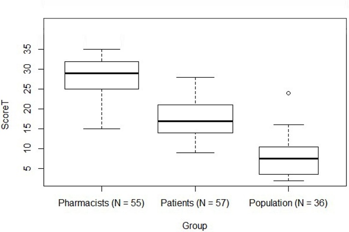 There were significant differences between the scores of the three evaluated groups (N=148) in the construct validity through the analysis of contrasted groups (Figure 1). The total mean scores of the pharmacist group, patient group, and population group were 29 [25-32], 17 [14-21], and 7.5 [3.75-10.25], respectively (F=209.49, P<0.001). Tukey’s post-hoc test showed significant differences for all comparisons (P<0.001).