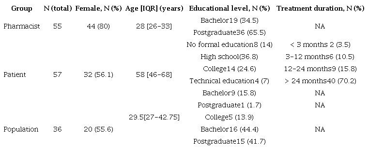 The final version of the AKT-Br (see Supplementary Material) was obtained through the consensus discussion of five anticoagulation specialists. Two hundred people were invited to participate in the study (75 pharmacists, 75 patients, and 50 people from the general population), of whom 148 met all eligibility criteria and were included for statistical analyses (55 pharmacists, 57 patients, and 36 people from the general population). Of this sample, 96 were women (64.9%), with a median age of 36 [IQR 28-53] years. About 67% of patients had used OAC for > 2 years (see Table 1).
