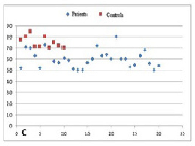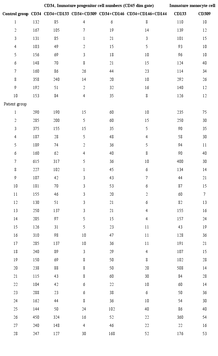 The number of EPC in a million (1×106) cell counts were counted by flow cytometry both in control and patient groups (Supplement). The numerical values of CD34+/CD309+, CD34+/CD146+, CD34+/CD146+/CD144+, CD309+, and CD34+ cells measured by gating in the control group are shown in Table 2.