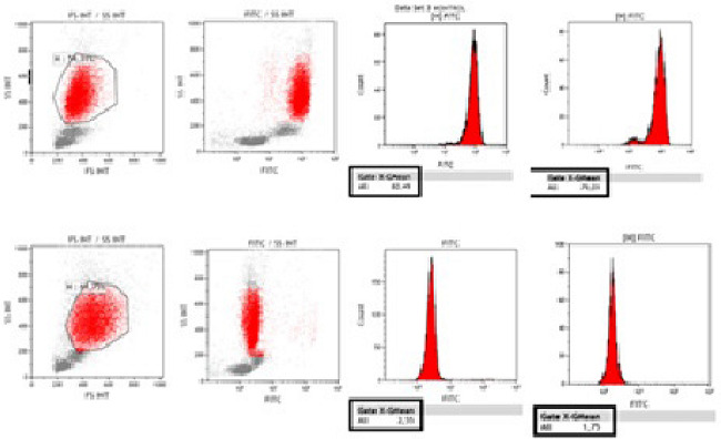 NADPH oxidase enzyme capacity evaluated with SI in patients was 60.4±7.8, and in the control group it was 75.1±5.2, by DHR assay (Figure 3). It was found that mean SI values were significantly lower in the patient group than in the control group (Figure 3). SI values of the DHR test in patients and controls are shown by flow cytometry analysis (Figure 4).