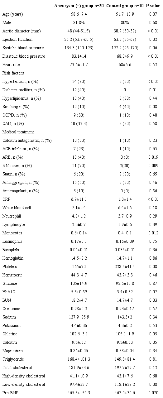 TAA patients (n=30, mean age 58.6±9.4 years), consisting of six women (mean age 58.5±12.9 years) and 24 men (mean age 58.6±8.7 years), and healthy controls (n=10, between 31-72 years), consisting of two women (mean age 58.5±19 years) and eight men (mean age 48.6±12.7 years), were included in this study. Patient and control groups were similar in terms of age and gender distribution.
