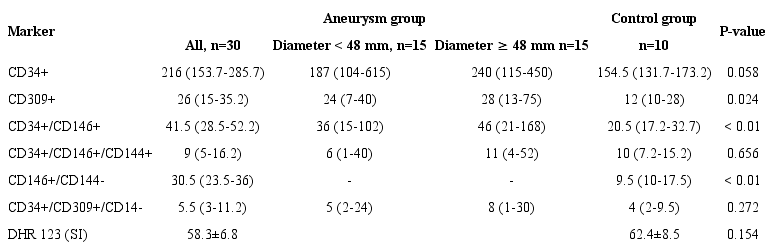 When the relationship between EPC numbers and clinical characteristics of the patients was evaluated, no statistically significant correlation was determined. However, there was a statistically positive correlation between aortic diameter measured by echocardiography and numbers of CD146+/CD144+ EPC. Comparing the number of EPC in patients with aneurysm diameter ≥ 48 mm with those with aneurysm diameter < 48 mm, CCD34+/CD146+/CD144+ cells were found to be significantly higher in patients with aneurysm diameter > 48 mm. For the other parameters, no significant difference was found between the two groups (Table 2). Flow cytometry results of the specific markers of EPCs according to the total cell count of the expression levels of controls and patients are shown in Figures 1 and 2.