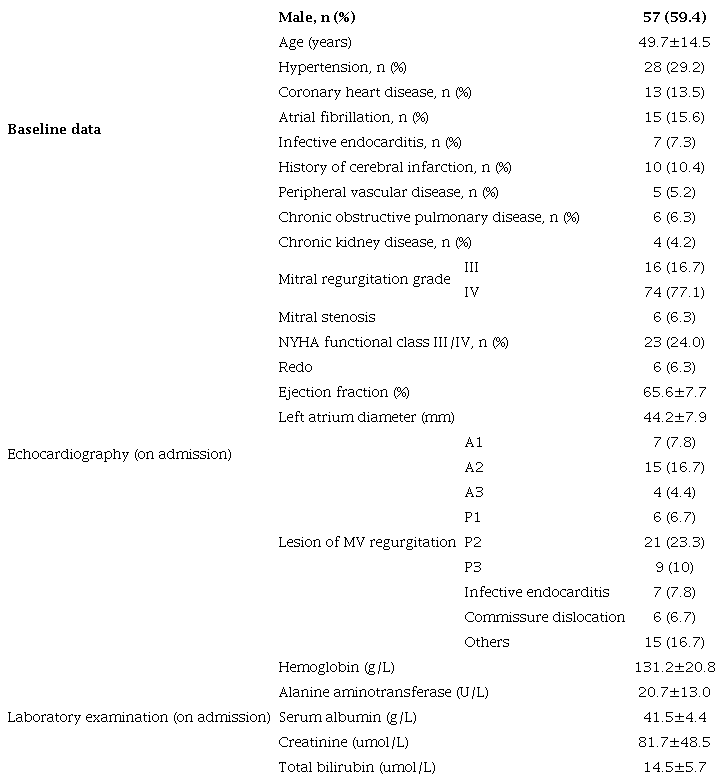 A total of 96 patients (males 59.4%, age 49.7±14.5 years) were included in this study. Table 1 shows the basic characteristics of the patients. Six patients underwent secondary cardiac surgery, of which two patients underwent MVP and the other four patients underwent congenital heart disease repair previously. Preoperative echocardiography showed that 93.8% of patients (n=90) had mitral regurgitation, of which 82.2% (n=74) were severe regurgitation. The lesions of MV regurgitation occurred mainly in A2 (16.7%, n=15) and P2 (23.3%, n=21) zones.
